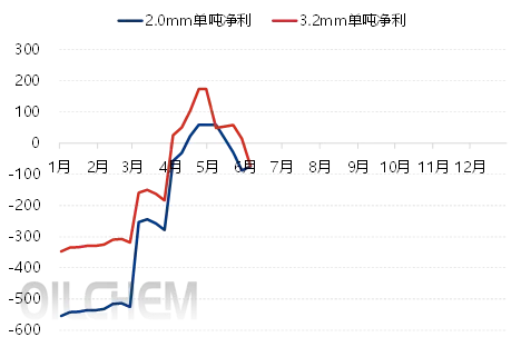 20252.0mm及3.2mm單噸光伏玻璃凈利走勢(元/噸)
